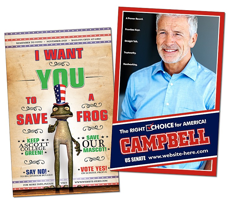 Flyers are a great way to advertise your political objectives. Posters are effective marketing tools used to communicate your message to prospective voters.